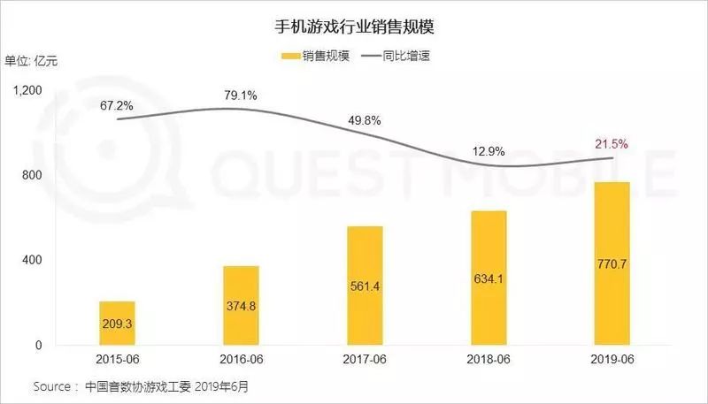 QuestMobile数据显示,截至今年6月,2019年上半年手机游戏行业销售规模达到770.7亿元,同比增速恢复到了21.5%,月活用户和增速也从去年的波动下跌,转为持续上涨,到6月份突破6.91亿。