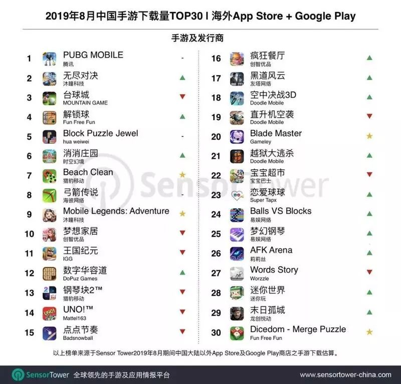 Sensor Tower最新数据显示,2019年8月期间中国手游产品在海外市场下载量排名Top 30,沐瞳科技两款游戏跻身前十,多款新游入围。其中,8月,腾讯《PUBG MOBILE》海外下载量超过4500万次,较今年7月上涨114%,同比增长204%,增量依然主要来自印度市场,印度玩家贡献了8月超过51%的海外下载量。