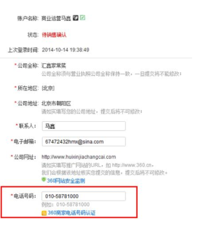 方法二. 360搜索,360广告后台---我的帐户---电话号码下方---360 商家电话号码认证如下图;