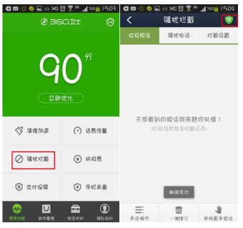 首先要保证已安装“360 手机安全卫士”确定版本为 5.2.2 以上,然后开启“骚扰拦截”中“360 手机卫士—诈骗先赔”功能。(操作完毕后再次通话便可进行查询。)具体如下实例截图开启操作如下示图