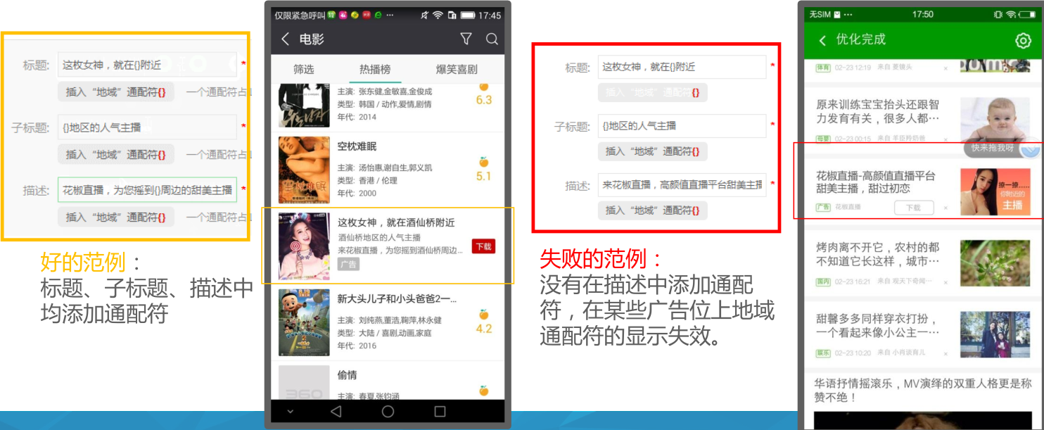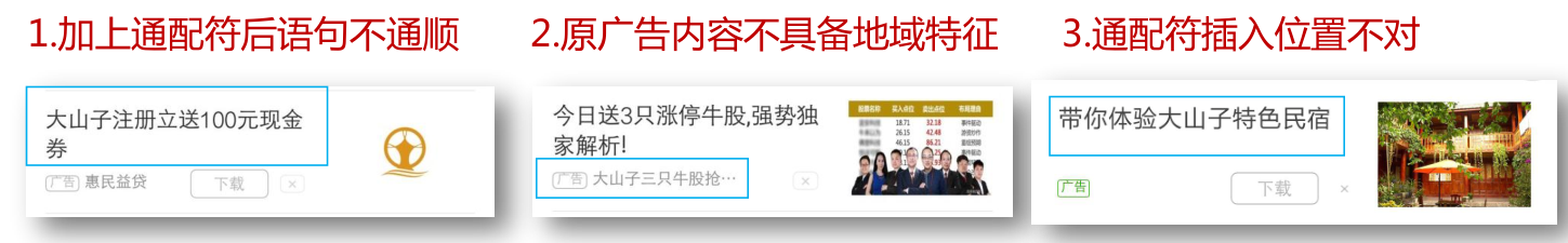 在 创 意 文 案 中 揑 入 创 意 通 配 符 { } , 因丌同媒体调取的展现字段丌同,为了通配符的成功展现,请保证在主标题、描述中均做添加。