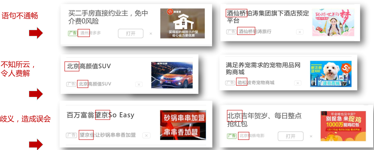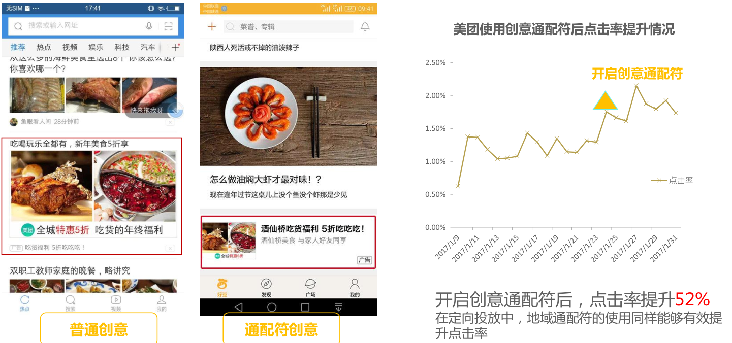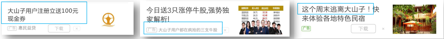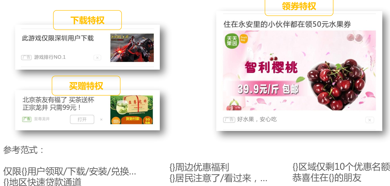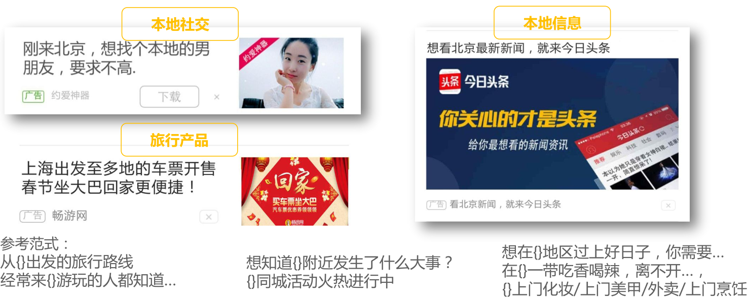 1.文案中 实时显示用户历史常出现位置 (安卓可以定位到商圈,ios定位到省直辖市),使得广告内容具有生活气息及针对性;