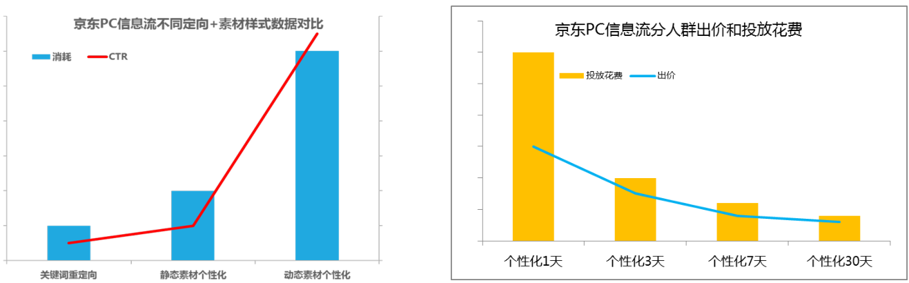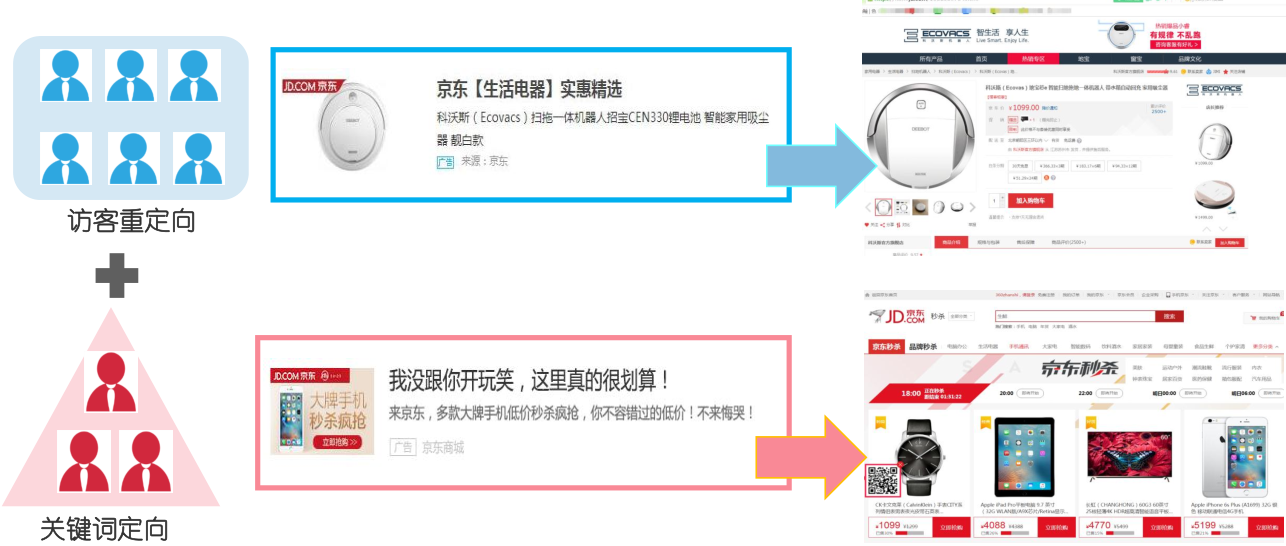 京东通过360PC信息流精准找回访客,将人群通过不同的信息流素材样式进行切分,将对活劢感兴趣的和针对单品的人群引流到不同页面,配合关键词定向挖掘搜索潜在人群。