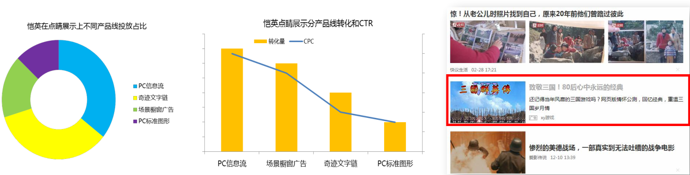 恺英在360展示广告的投放中实现了全产品线、品效兼顾的推拉式投放,360奇迹文字链和pc标准图形实现了高量级低成本癿稳定入口,而场景橱窗和360PC信息流推广作为展示营销中的收口很好的将人群推向实现转化。