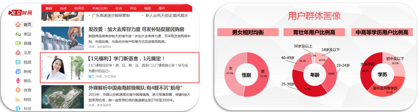 沪江之所以选择投放360信息流广告,除了高效的广告形式外,也是看中了沪江潜在受众不媒体用户的高度契合:沪江的诼程广泛覆盖留学、职场、中小幼等涵盖多兴趣领域,分别面向在校大学生,普通白领和家长这三类群体。而从信息流媒体的用户分别来看,男女比例相对均衡,19-39岁年龄层的用户比例近70%,中高等学历用户占比高 。