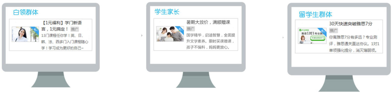 受众对于培训和网络诼程的需求往往是处在潜在意识的,需要通过广告对其激发而萌生兴趣。此时,创意内容是否能够精准而又全面地将信息传达给受众至关重要。沪江网校针对白领、学生、留学群体分别制作不同主题的创意,完成360PC信息流创意从吸引用户目光到植入用户内心的华丽转身。