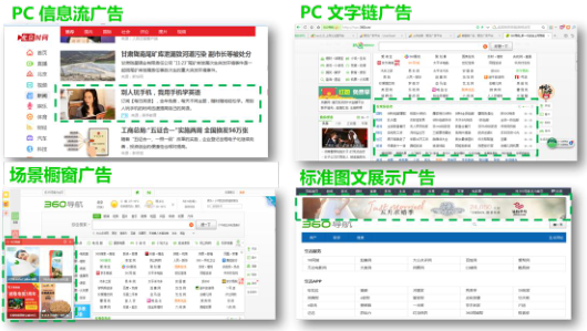 360展示广告 PC 端四大广告形式 汇聚网民注意力,流量足以解决广告曝光需求,让广告主倍增广告展现机会。