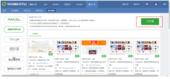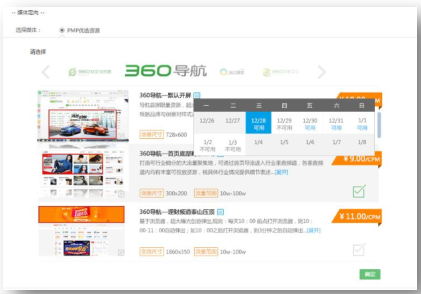 PMP是将360站内的“品牌展位”对中小广告主进行开放,广告主可通过360广告后台购买例如“360导航首页默认开屏广告”等高质量广告位,并根据需求设定地域,人群等条件,提升投放精准性。例如只针对“淄博地区男性网民”投放“360导航开屏广告”帮助中小广告主在精细化预算的前提下,对品牌流量按需投放,实现品牌价值的增值。
