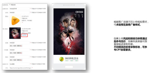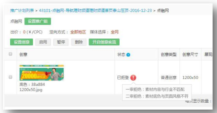 上传360广告创意需通过风控和媒体的审核后,方可参与竞价。广告主可在创意列表界面查看物料审核进度和审核结果