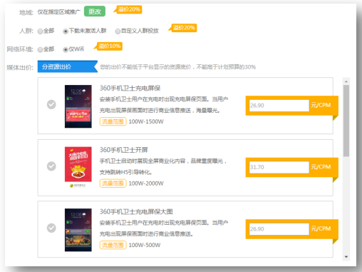 选择不同定向(地域、人群、网络环境)可提升流量精准度,但会相应地增加竞价成本,最终出价为报价和溢价比例相乘所得资源池中可见资源为行业屏蔽和媒体白名单过滤后的可投资源客户可根据资源介绍、报价等信息选择资源。