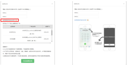 3.创意实览仅作为展现参考,不记录为真实数据。实际投放量将取决于竞价和媒体限制等原因。输入需要查看创意的手机 IMEI 信息,点击【开启创意实览】按钮,使用相应手机刷取创意,时效 5 分钟。※鼠标放置下图红框处,可查看 IMEI 查询方法。