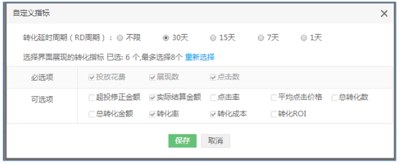 注:至少选择一个时间周期,或不限;最多可选择 8 个转化指标;