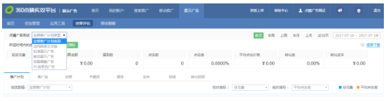 a) 提供全部360推广计划类型:全网跨屏文字链、360标准展示广告、360场景橱窗广告、360移动展示广告四种选择;且可查看不同时间范围的数据。