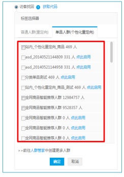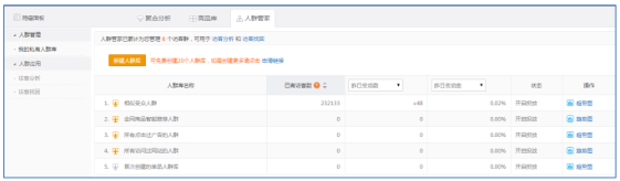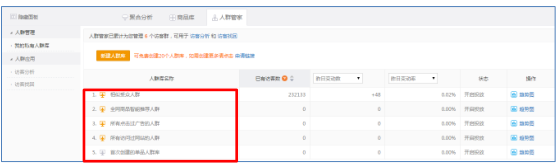 360广告后台人群管家设置完成后在访客找回定向页面的普通人群及单品人群列表中就可以找到之前设置的人群,点击该人群后的“点击启用”即可实现投放。