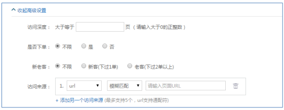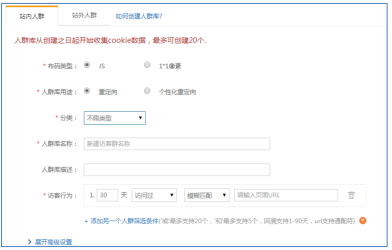 ★ 所有访问过网站的人群:需要先部署“到达转化”代码在您的网站所有页面,即可马上收集访问过页面的人群,人群的数量每天更新一次。