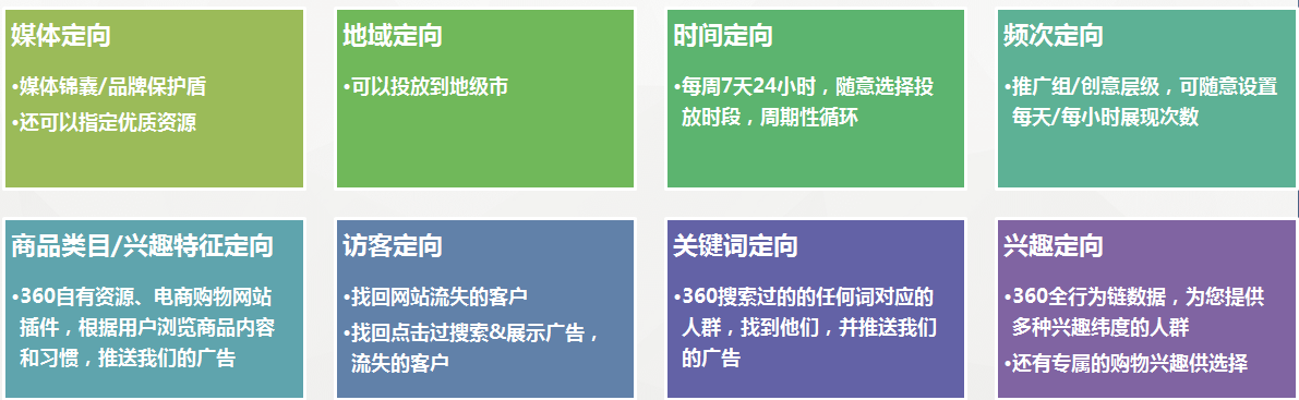 不限人群 | 不限媒体(目前有北京时间、360全能看、360娱乐等,接下来会持续增加360站内资源) | 非限制行业客户必选 | 1元起 | ||