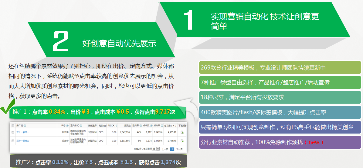 还在纠结哪个素材效果好?别担心,即使在出价、定向方式、媒体都相同的情况下,系统仍能赋予点击率较高的创意优先展示的机会,从而大大增加优质创意素材的曝光机会。同时,您也可以更低的点击价格,获取更多的点击。