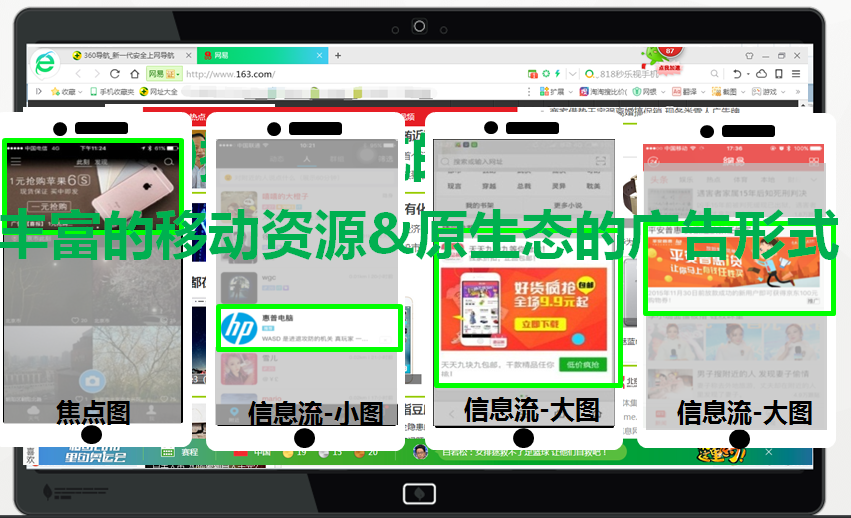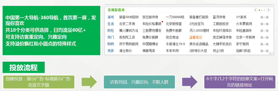 360展示广告独家资源,DSP行业绝对领先的技术将广告内容以单个商品的形式融入不同的单品推荐场景,支持全行业客户投放(敏感行业除外)流量巨大、操作简单,且以360资源为主人群实现实时更新(代码收集人群&智能人群)。