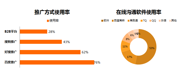 20%以上的客户选择好搜、搜狗、百度同时推广,40%以上的客户至少选择两种推广方式共同使用;网站在线客服除百度商桥外还有40%客户会选择商务通等软件,凸显该行业网络推广意识强烈,且成熟度高。