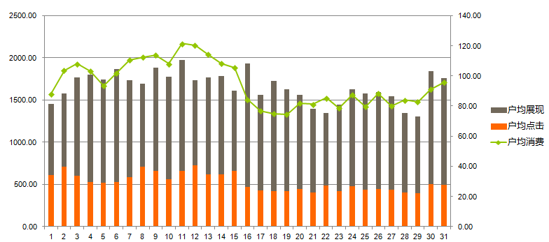 户日均消费在100元左右,展现1500次左右,点击日均在25次左右,产品线越多消费和展现点击也越高,跟客户谈预算时需有视客户产品线而定。