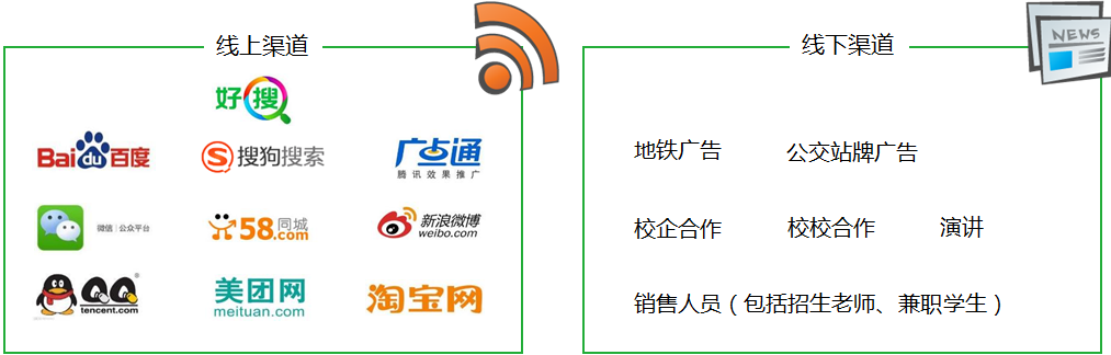 所有机构都会同时采用线上和线下渠道,线上渠道使用多的是:百度、好搜、搜狗、广点通;线下渠道使用多的是:销售人员(职业院校)、平面广告(专业资格)、校企合作、演讲(技能培训)。