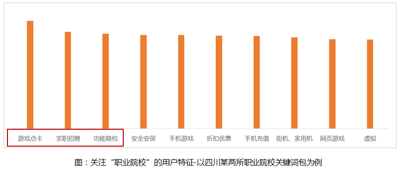 关注 “职业院校”的网民大的兴趣点集中在:游戏点卡、求职招聘、功能箱包。这也符合目标人群是学生、即将中学毕业、可能到外地求学的特点。客户进行推广时,可考虑在游戏平台、招聘网站、B2C购物网站同时投放广告。
