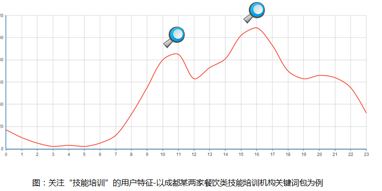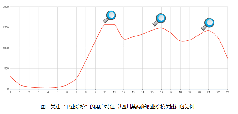 关注 “职业院校”的网民有3个搜索高峰时段:10-11点、16点、21点。客户推广时间段建议从8:00-24:00,特别要覆盖到三个高峰时段。