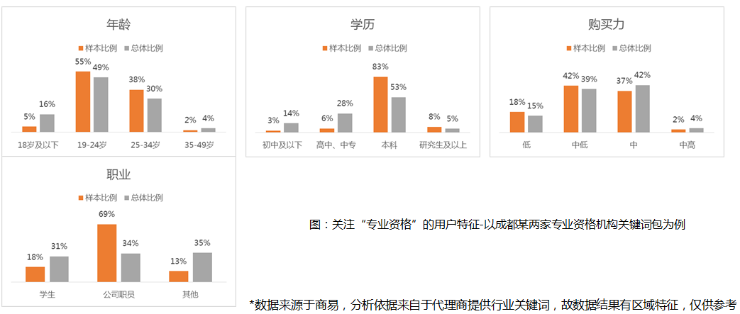 关注 “专业资格”的网民有以下特点:年龄19-34岁、本科以上学历、购买力中等偏低,主要为在职人员,还有小部分学生。相关机构进行网络推广时,应重点满足此类用户需求,例如网页设计和创意撰写上更加时尚、职业;显示课程价格时突出折扣力度、赠品,如“原价1999元,现价999元”“每节课仅8元”;展示成功学员案例并强调薪资,如“毕业就进上市公司”“年薪20W不是梦”等。