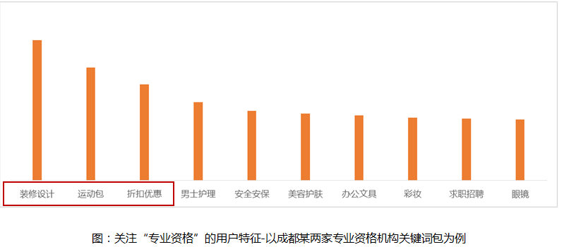 关注 “专业资格”的网民大的兴趣点集中在:装修设计、运动包、折扣优惠。客户进行推广时,可考虑在装饰装修网站、论坛、 B2C购物网站同时投放广告。