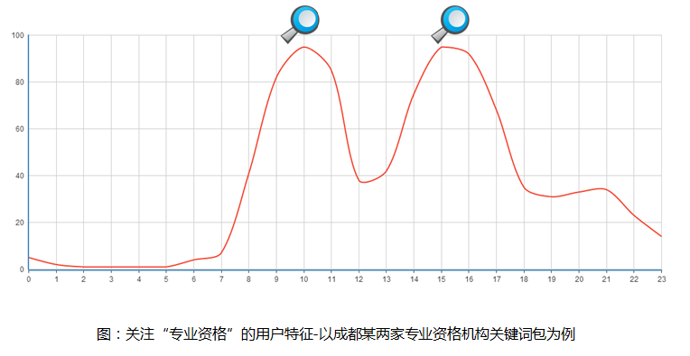关注 “专业资格”的网民有2个搜索高峰时段:10点、15-16点。客户推广时间段建议从8:00-18:00。