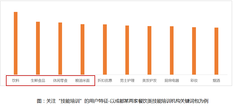 因关键词包以餐饮培训为主,关注 “技能培训”的网民大的兴趣点集中在:饮料、生鲜食品、休闲零食、粮油米面。客户进行推广时,可考虑在食品类门户网站、购物网站同时投放广告。