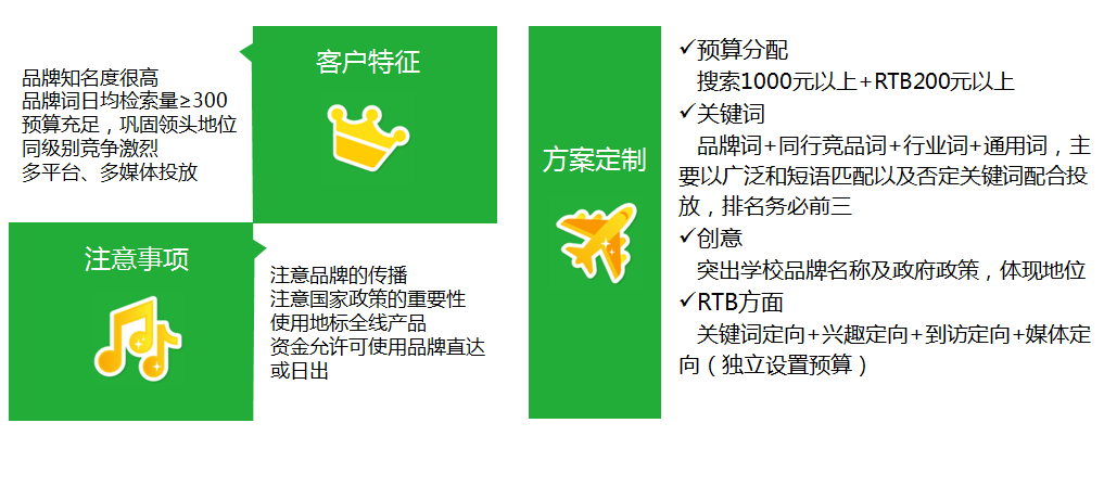 客户特征:品牌知名度很小,一般选择百度、好搜、搜狗来推广,预算资金有限,控制严格