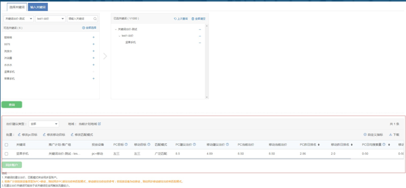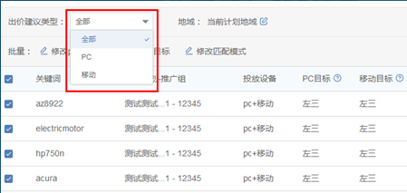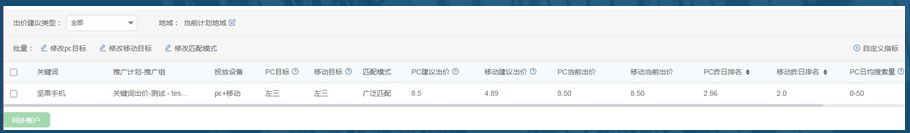 A:若推广计划投放设备类型为PC+移动,则仅同步PC建议出价和匹配模式,移动建议出价仅供参考;若投放设备为仅移动,则仅同步移动建议出价和匹配模式。