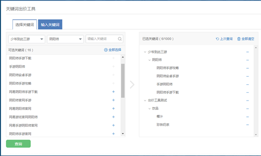 ★已选关键词区域可以点击“上次查询“直接展示上次查询的全部关键词及所在推广计划和推广组,但已选择关键词将被覆盖。