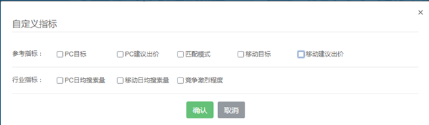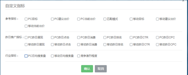 输入关键词建议出价表格区域内容与选择关键词逻辑一致。但默认指标及自定义指标均没有昨日推广指标内容。