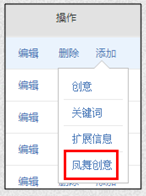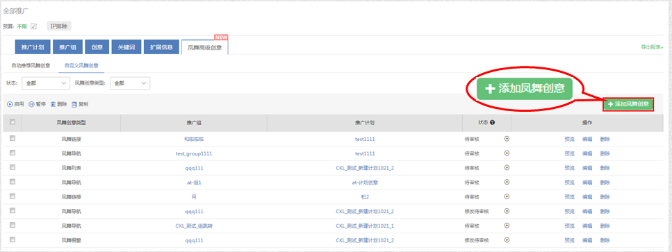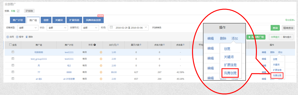 2、【推广组】TAP页面,操作列【添加】按钮中的【凤舞创意】按钮
