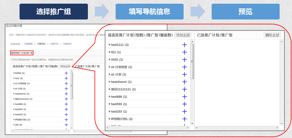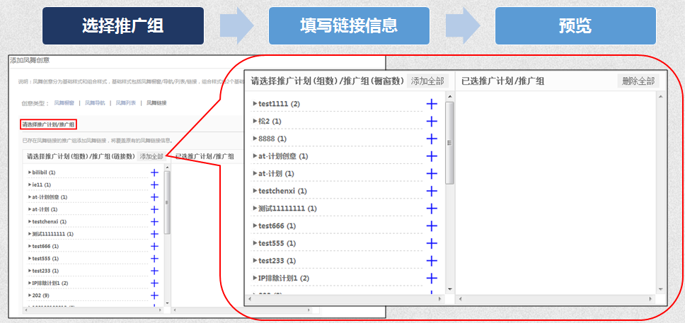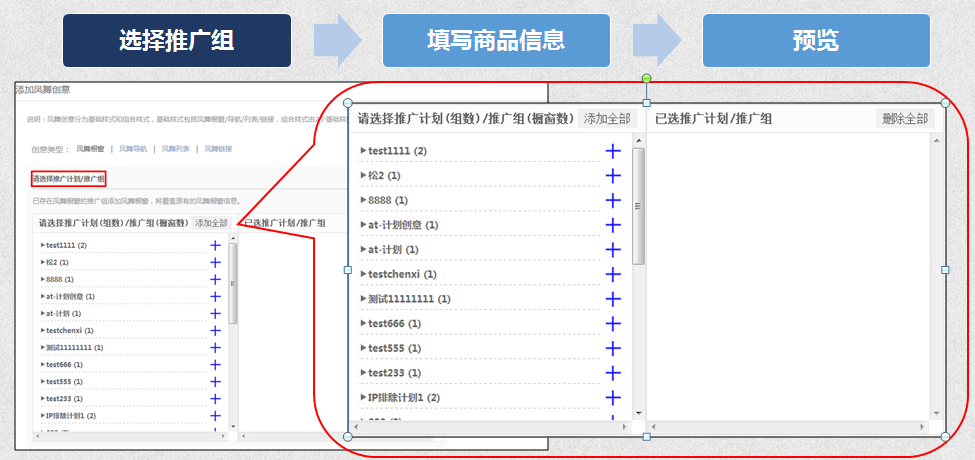 例如:推广组A已经添加凤舞橱窗样式创意,则再次添加凤舞橱窗样式创意时将覆盖原有创意内容