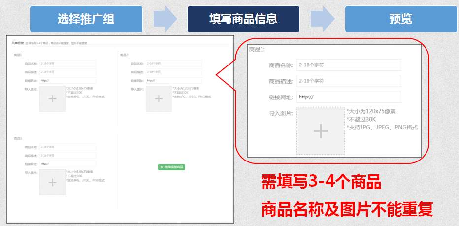 凤舞橱窗 | 1、需填写3-4个商品 2、商品名称及图片名称不能重复 |