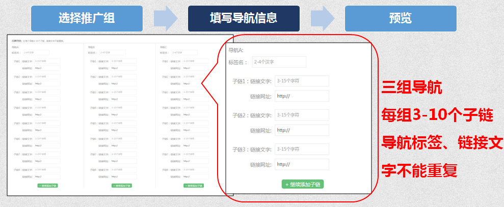 凤舞导航 | 1、需填写3组导航 2、每组导航需填写3-10个子链 3、各组导航的链接文字不能重复 |