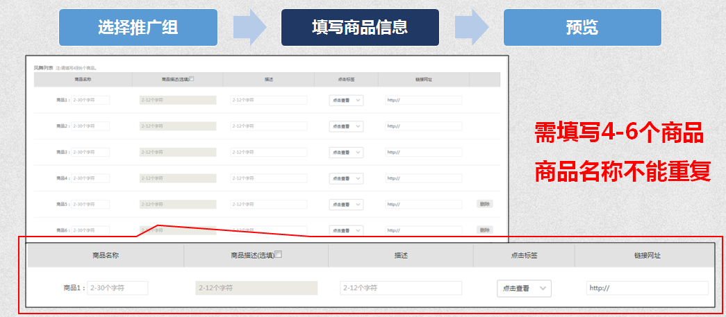 凤舞列表 | 1、需填写4-6个商品 2、商品名称不能重复 |