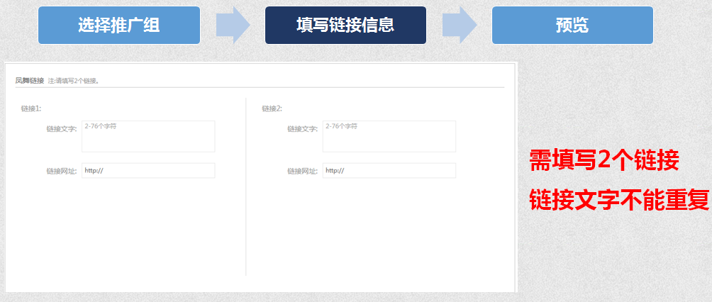 凤舞链接 | 1、需填写2个链接 2、链接文字不能重复 |