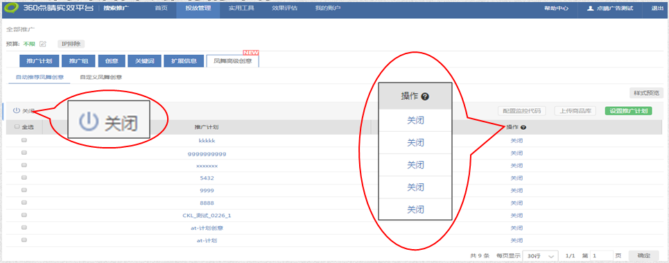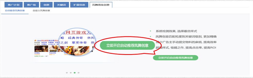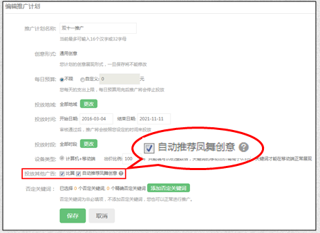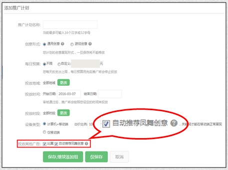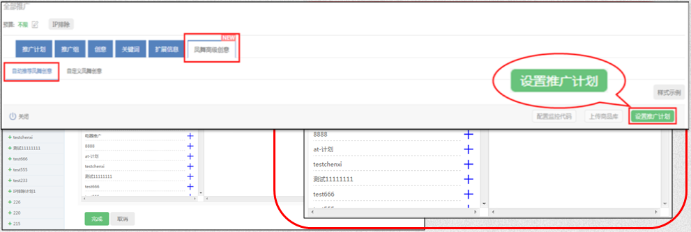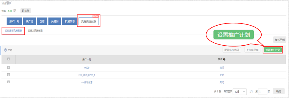 2、在【凤舞高级创意】【自动推荐凤舞创意】【设置推广计划】页面,批量开启【自动推荐】创意提交方式