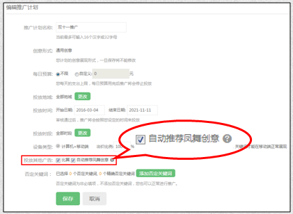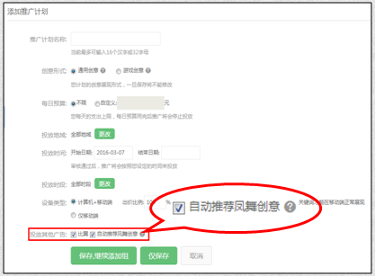 1、在新建计划/编辑计划页面,单计划开启【自动推荐】创意提交方式