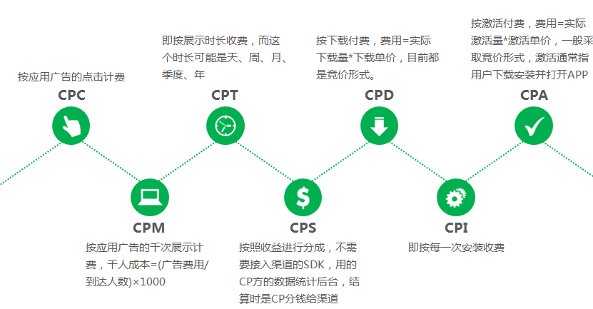 CPA (Cost Per Action) ——按激活付费,费用=实际激活量*激活单价,一般采取竞价形式。激活通常指用户下载安装并打开APP,各检测平台具体标准可能有所不同。