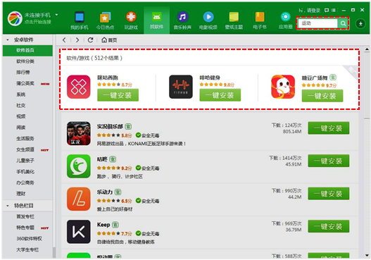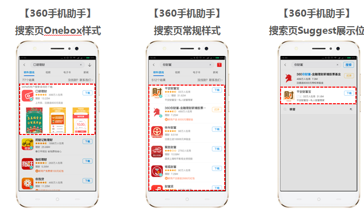 【360手机助手】PC端,搜索结果页顶部共有3个APP广告位