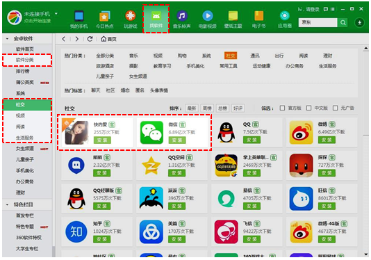【360手机助手】PC端,找软件-软件分类【社交】【视频】【阅读】【生活服务】4个分类下,前2位为APP广告位