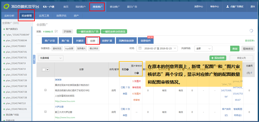 360广告创意配图是在360搜索推广创意添加环节将图片与基础文本创意进行整合,使用此功能后,360搜索推广的展现结果中,图文创意可展现位置更多,图片将转变为基础创意的一部分,更符合广告主的物料提交习惯,方便广告主上传图片创意,提高创意图片覆盖率;同时,系统会逐步积累数据,并根据用户搜索意图和创意信息,优选适合的图片进行前台展现,提升ctr和roi。