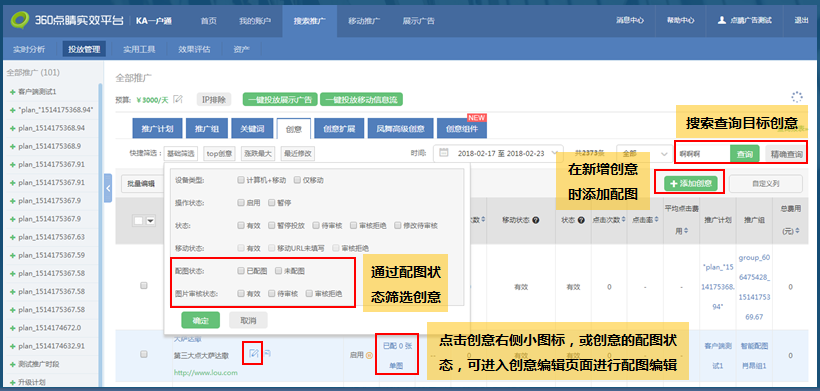 可以通过筛选和搜索查询功能,选择已有创意进行添加&修改配图;或者在新增创意时添加&修改配图。
