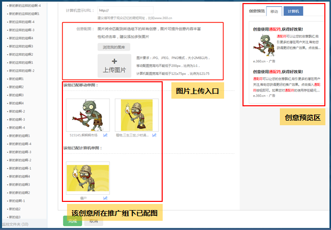 ★新增创意时,若选择的360推广计划和360推广组下已存在配图,将显示这些配图;已存在的配图可进行主题修改和图片删除操作;对该创意配图进行的任何修改,将会应用到该创意所在组下的所有创意。