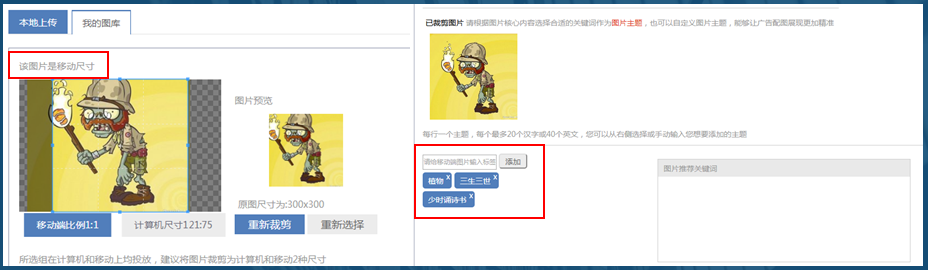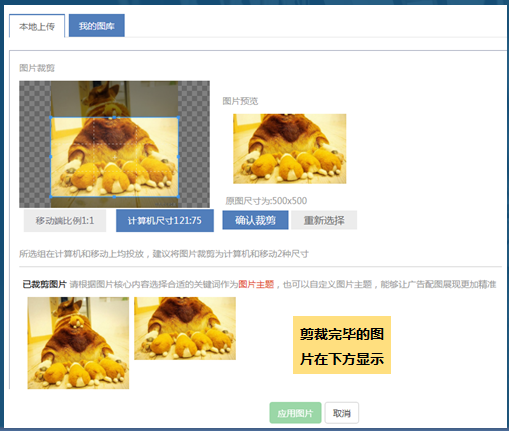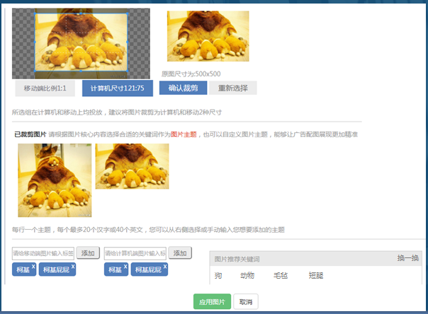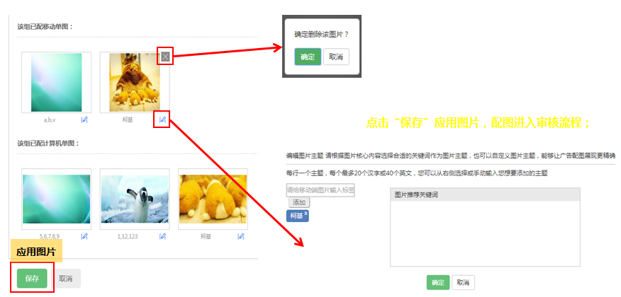 图片剪裁完毕后,返回创意编辑界面,显示该条创意已配图片;点击图片右下角图标,可对该张图片主题进行重新编辑;点击图片右上角“x”,可删除该张图片;点击“保存”应用图片,配图进入审核流程;